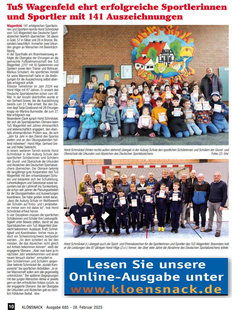 Im Sportabzeichen-Wettbewerbe 2024 war der TuS Wagenfeld in der Wertungsgruppe 3 (mehr als 1000 Mitglieder) sehr erfolgreich und hat mit 140 verliehenen Sportabzeichen den 1. Platz belegt.